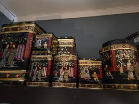 Plåtburkar med kinesisk motiv.