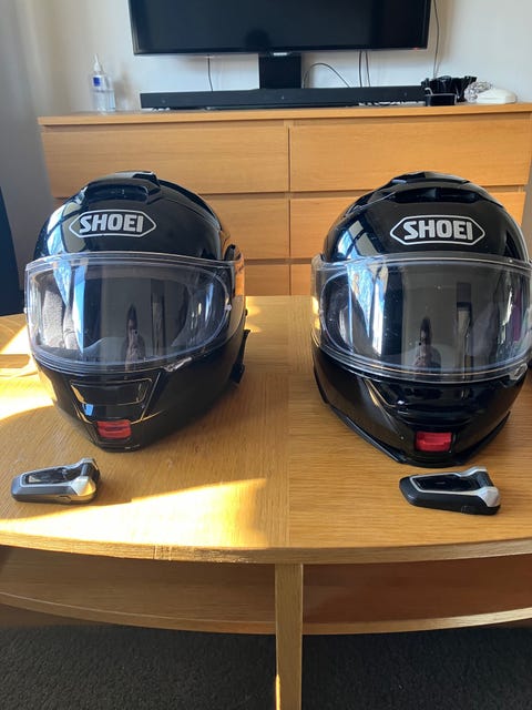 Begagnade motorcykelhjälmar och hjälmhuvor