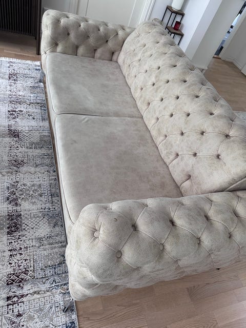 Gråmelerad 3-sits soffa med 2 fotpallar.