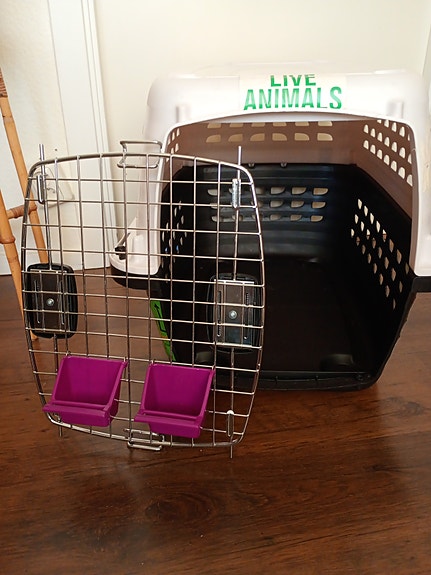 Transportbur för djur med metallgrind och matkoppar