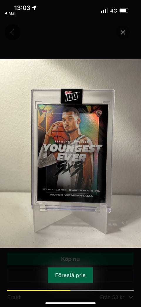 2 000 krTopps Now basketkort Victor Wembanyama Youngest Ever 5x5 /99Brandbergen2 febKöp nuLastbil i rörelseKan skickasLägg till i favoriter.