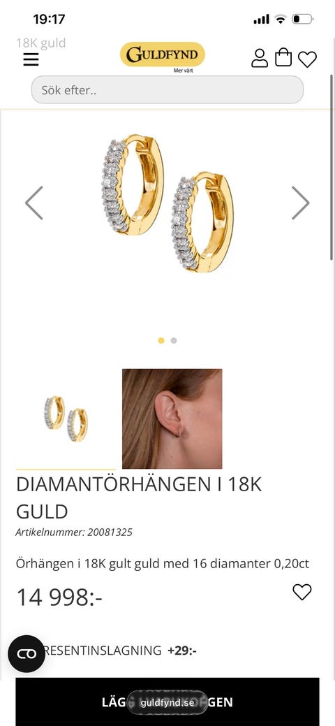 7 500 krDiamantörhängen 18k 0,20 ctStockholm15 minKöp nuLastbil i rörelseKan skickasLägg till i favoriter.