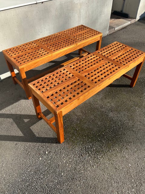 4 000 krTräbänkar ett par i teak från 1900-tal i toppskick utomhus gallerdesignJärfälla2 dagarLägg till i favoriter.