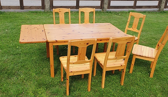 Furubord med 6 stolar.
