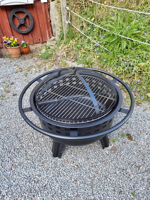 Rund eldstad med grillgaller i svart metall