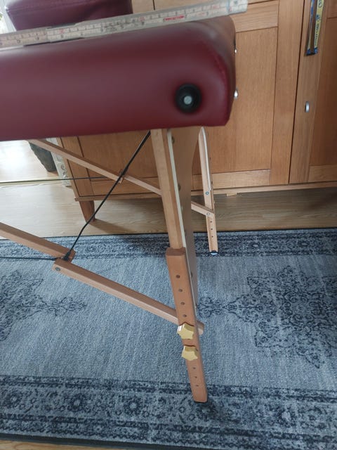 Massagebänk med trästativ och vinrött konstläder