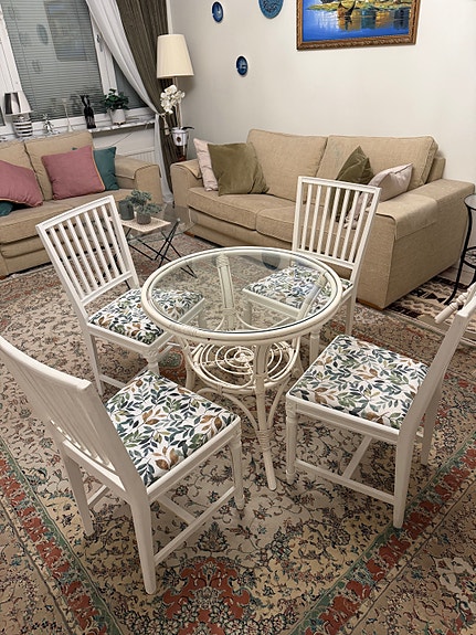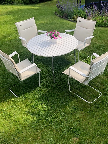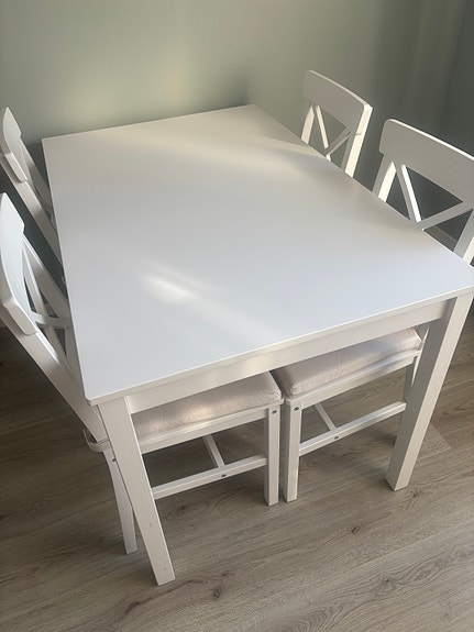 Vit matbord & 4 stolar med dynor