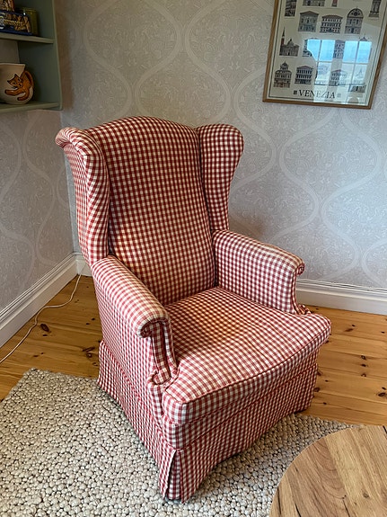 Rutig fåtölj bortskänkes