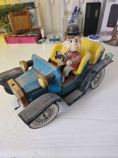 Plåtleksak bil med figur