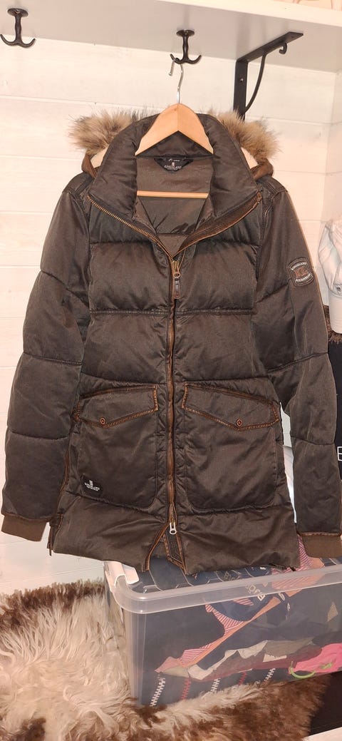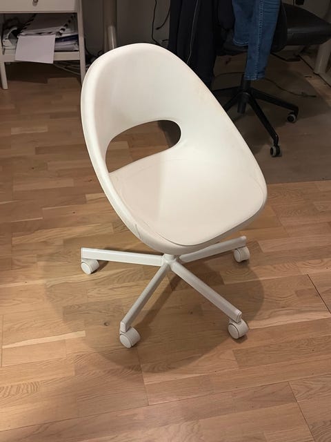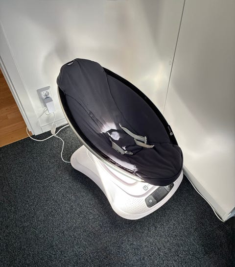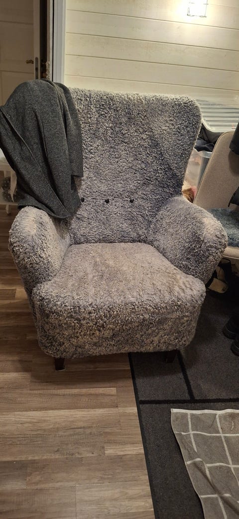 Fårskinns fåtölj med mocka tyg .