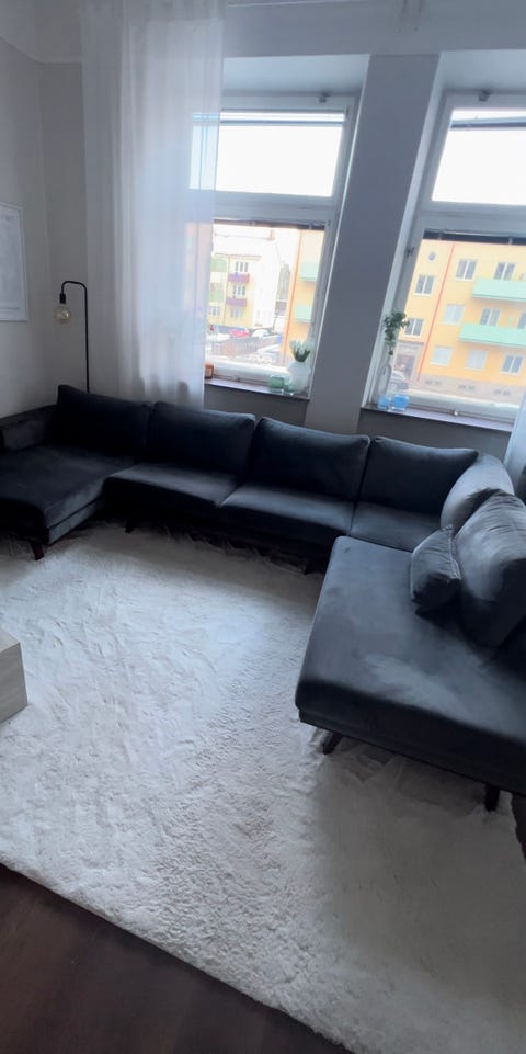 Hörnsoffa i sammet.