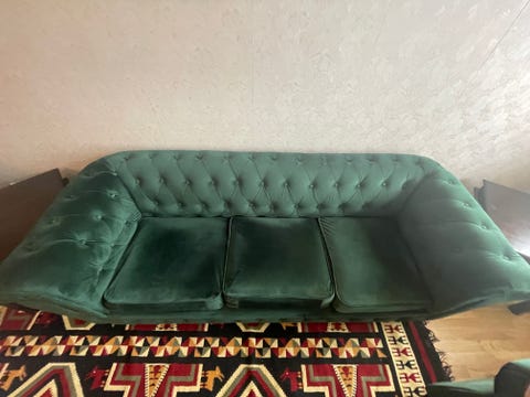Grön sammet soffa och fåtölj set