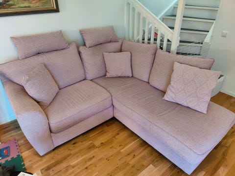 Mysig hörnsoffa I rosa tyg