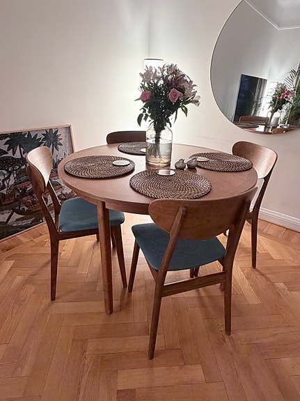 12 000 krRunt matbord i teak/valnöt + 4 danska stolar (mid century)Nyköping5 dagarLägg till i favoriter.