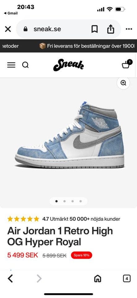 4 500 krAir Jordan 1 Retro High OG Hyper RoyalStl. 46 Air JordanTranås28 oktLastbil i rörelseKan skickasLägg till i favoriter.