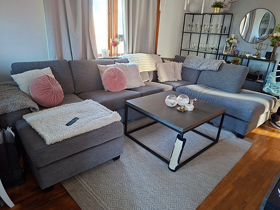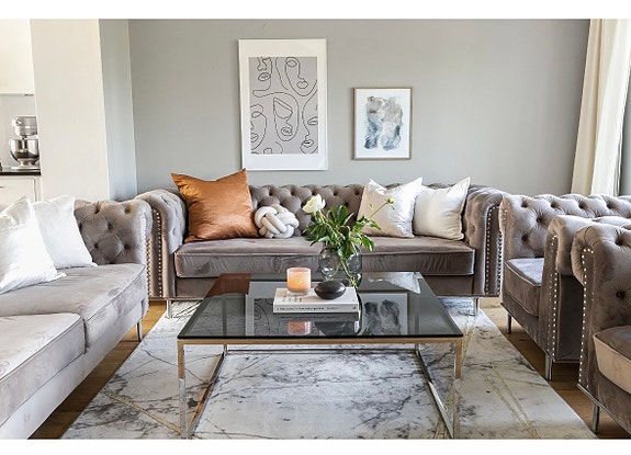 Soffgrupp vardagsrum sammet grå