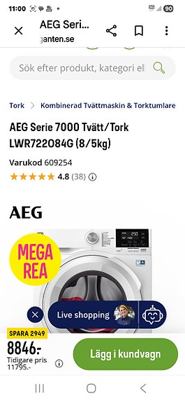 4 800 krAEG Serie 7000 LWR722084G kombinerad tvättmaskin torktumlare vit 8/5 kgÄngelholm2 aprLägg till i favoriter.