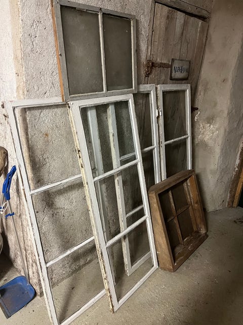 Gamla träfönster spröjsade