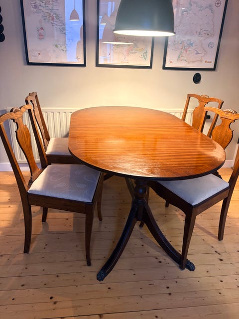 Matbord med 8 sammet stolar.
