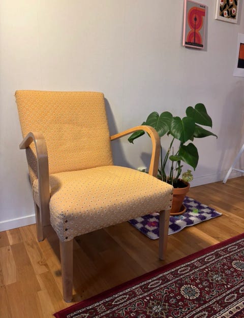 200 krRetro klädd fåtölj (gult mönstrat tyg, armstöd i bentwood-stil)Vårgårda2 timLägg till i favoriter.