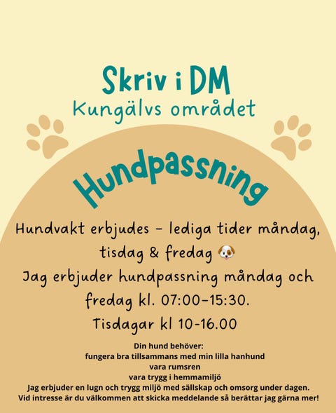 KöpesHundpassning i Kungälv – måndag, tisdag och fredagKungälv1 timLägg till i favoriter.Öppna annons