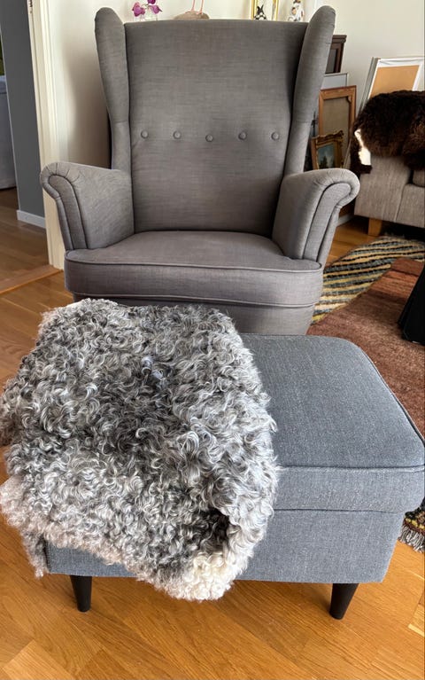 Skinnfåtölj med fotpall