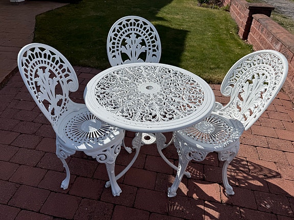 3 000 krVit trädgårdsgrupp i metall – runt bord + 3 stolarÖrebro6 timLägg till i favoriter.Öppna annons