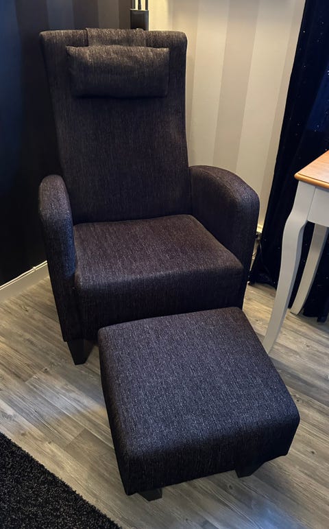 Fåtölj med fotpall i grått tyg