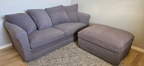 Soffa, fotpall och soffbord.