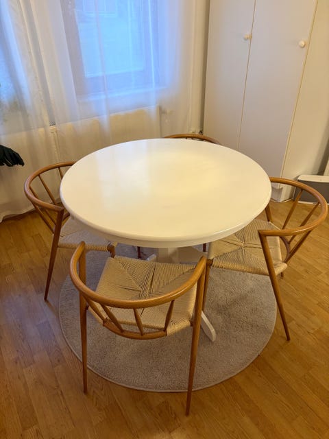 7 500 krRunt matbord med 4 stolar – stilren design i mycket fint skickStockholm22.12.25Lägg till i favoriter.