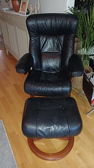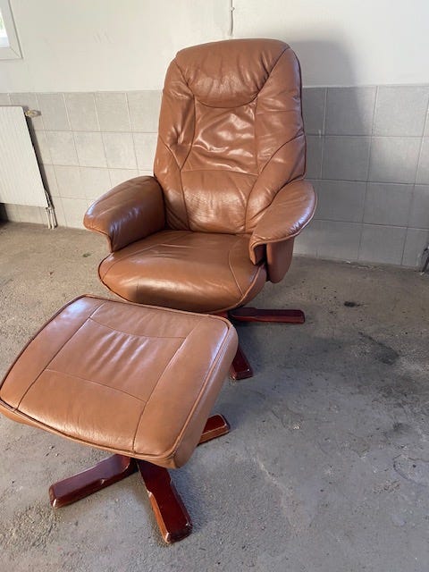 Skinnfåtölj med fotpall