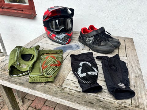Cykelskor, hjälm och skydd