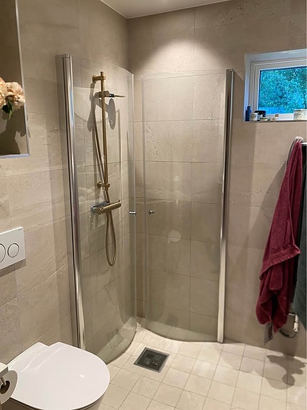 Duschkabin och duschvägg skyddar resten av badrummet