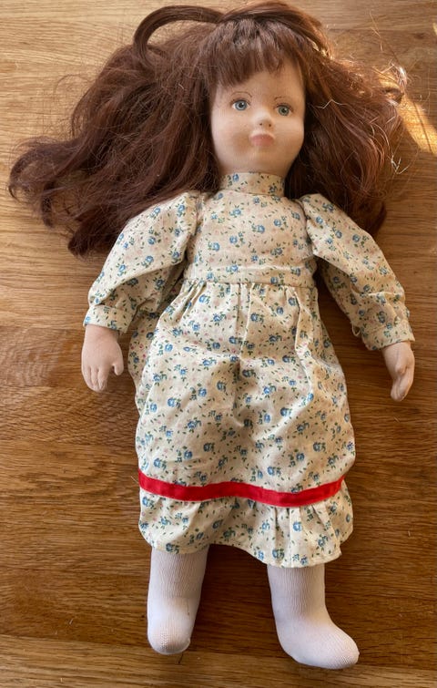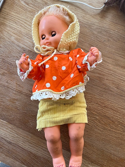 Vintage Docka med kläder orange prickig tröja och gul kjol