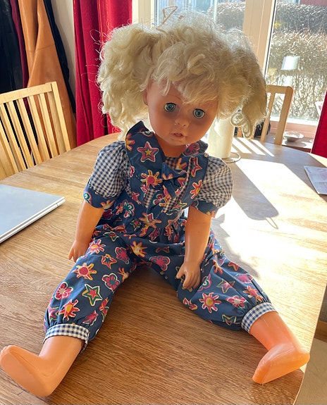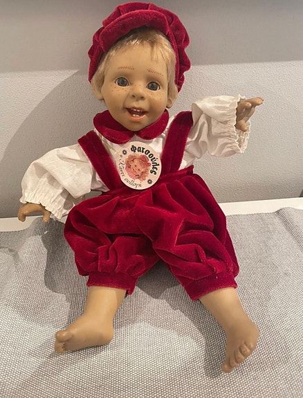 Vintage docka med blont hår och blå mönstrad sparkdräkt
