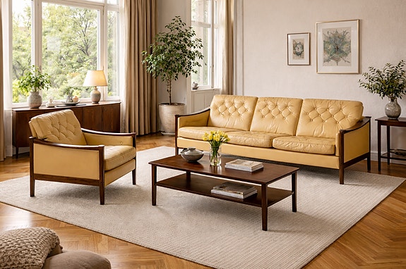 10 400 krTorbjørn Afdal “Studio” soffa + fåtölj, palisander-ljus läder (ca 1960)Arlöv19 febLägg till i favoriter.