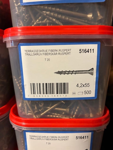 6 000 krTerrasskruv fiber ruspert 4,2x55 mm 500-pack 24 stKolmården11 aprLägg till i favoriter.Öppna annons