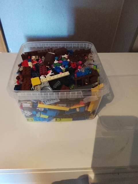 En godislåda med blandade lego bitar
