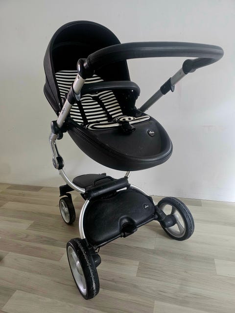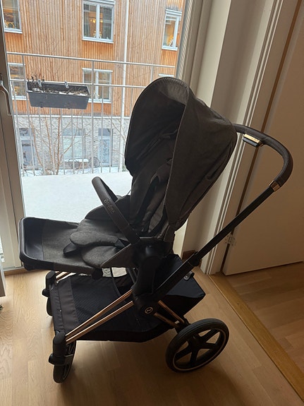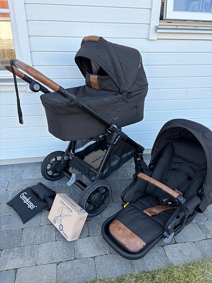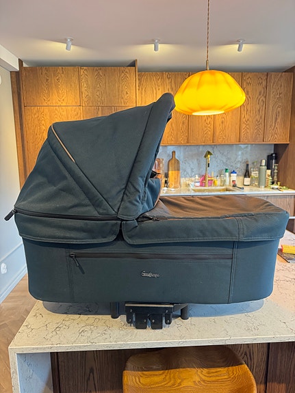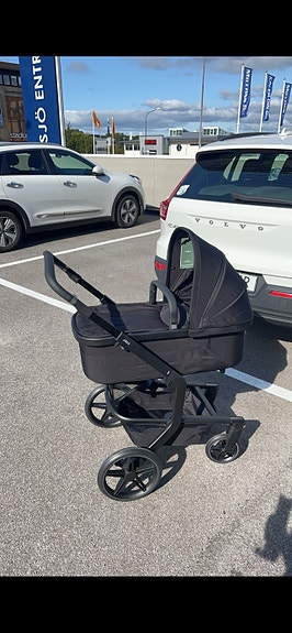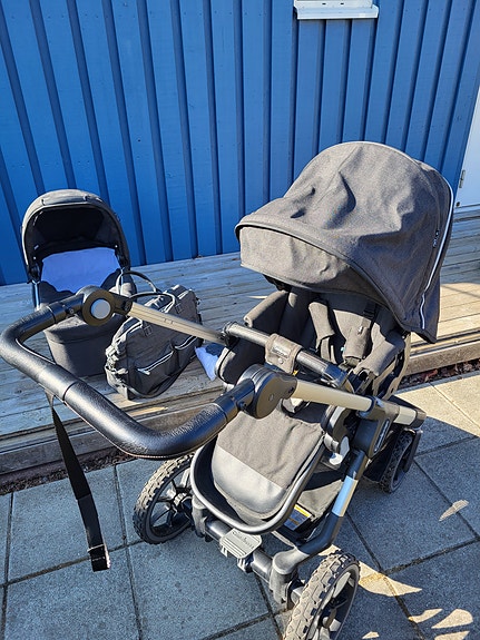 Stokke barnvagn med liggdel och babyskydd grå