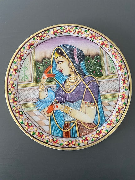 Marmor tallrik med handmålat motiv ca 22,5 cm