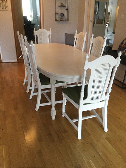 3 000 krMatgrupp matbord med iläggsskivor och 6 stolar vit trä grön sitsSundsvall25 minLägg till i favoriter.