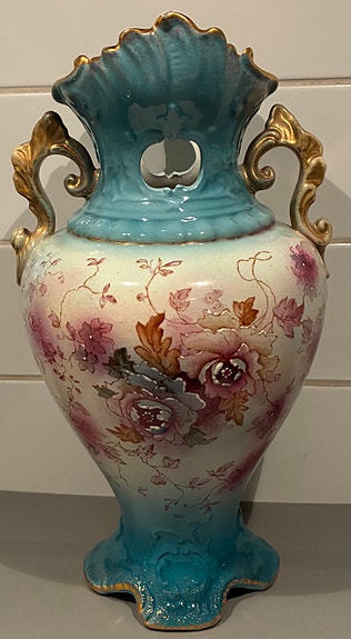 Stämplad porslin Vas blommönstrad turkos och vit med guldhandtag