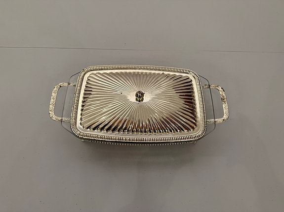 Rektangulär ugnsform med glasinsats och metallställ med lock
