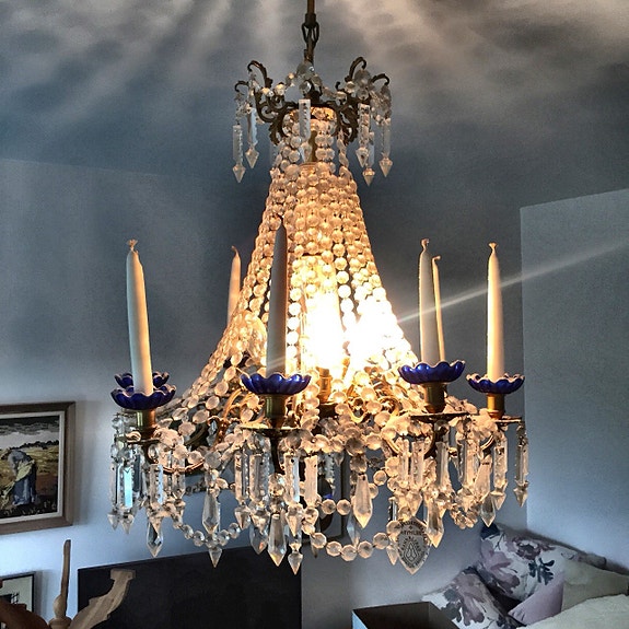Gå till resultatenStor kristallkrona Rejmyra 1950-tal – 8+8 ljuspunkter, empire/gustaviansk stil