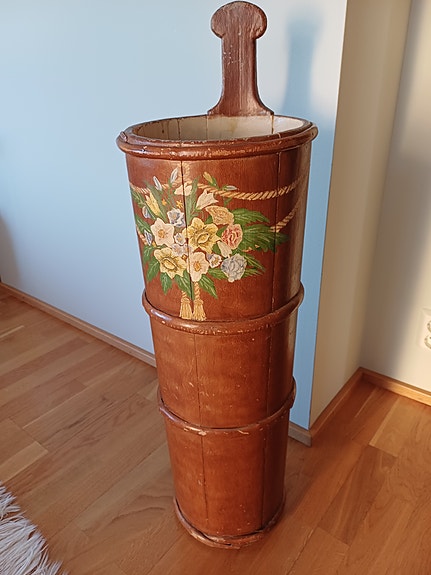 Trätunna/smörkärn med handmålad blomstermotiv brun flerfärgad