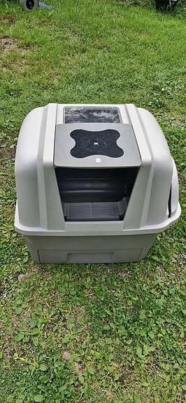 Kattlåda med huv och katttransportväska plast och textil vit grå röd