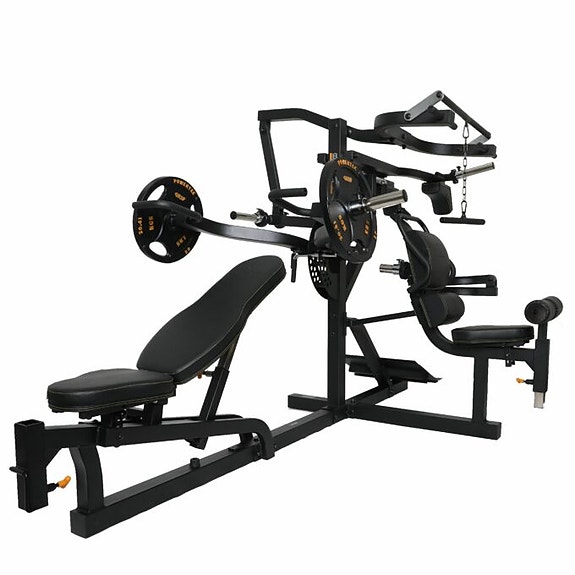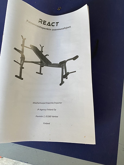 Skivstångsställning med bänk, viktskivor och golvplattor