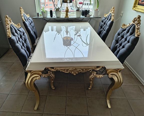 30 000 krVitt matbord med guld ben och 4 stolar i guld och svart grå klädsel med mönster.Göteborg9 timLägg till i favoriter.Öppna annons