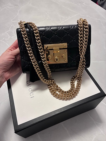 12 000 krGucci axelremsväska läder kvinna svart med guldfärgad kedja GucciÖrebro24 febLägg till i favoriter.
