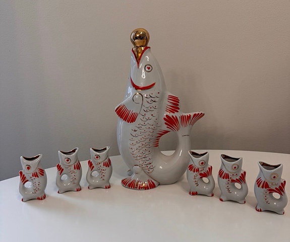 USSR porslin. Brännvin LFZ Fisk Likör set. Servis Sovjetunionen.CCCR. Lomonosov